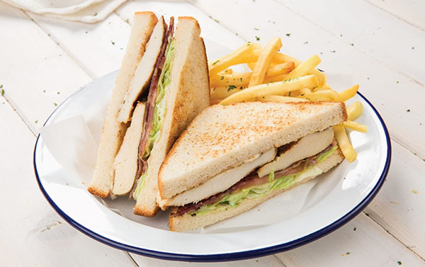 | Two pieces of grilled chicken breast, cheese, lettuce, tomato, American bacon slice, mayonnaise |